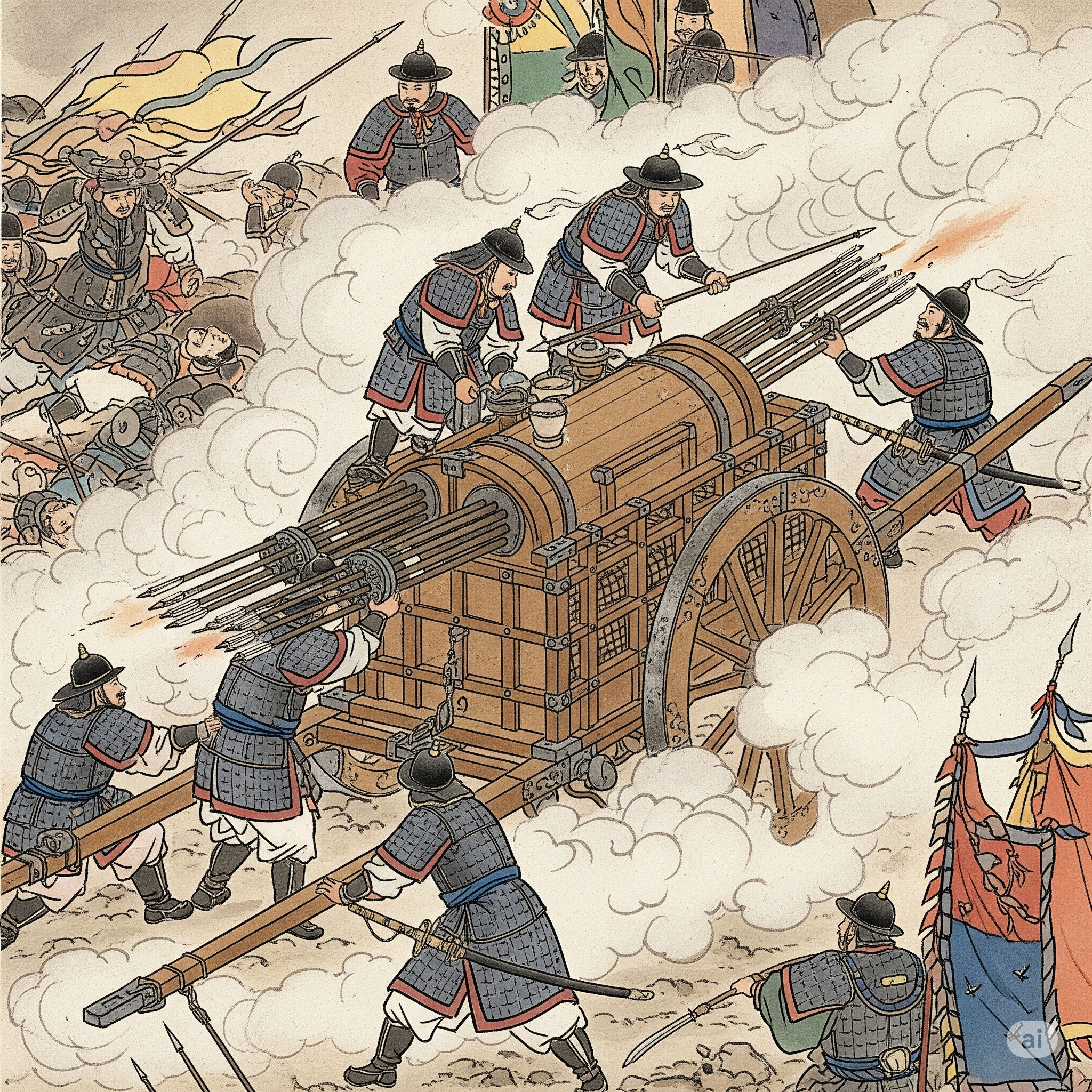 - 사례: 행주대첩(1593년)에서 화차는 조선군의 전력 열세에도 불구하고 왜군에게 큰 피해를 입히는 데 기여했습니다. 특히 변이중이 개량한 망암(望庵) 화차는 방어벽을 추가하여 병사들을 보호하면서도 화력을 집중할 수 있도록 설계되어 전술적 효과를 극대화했습니다.